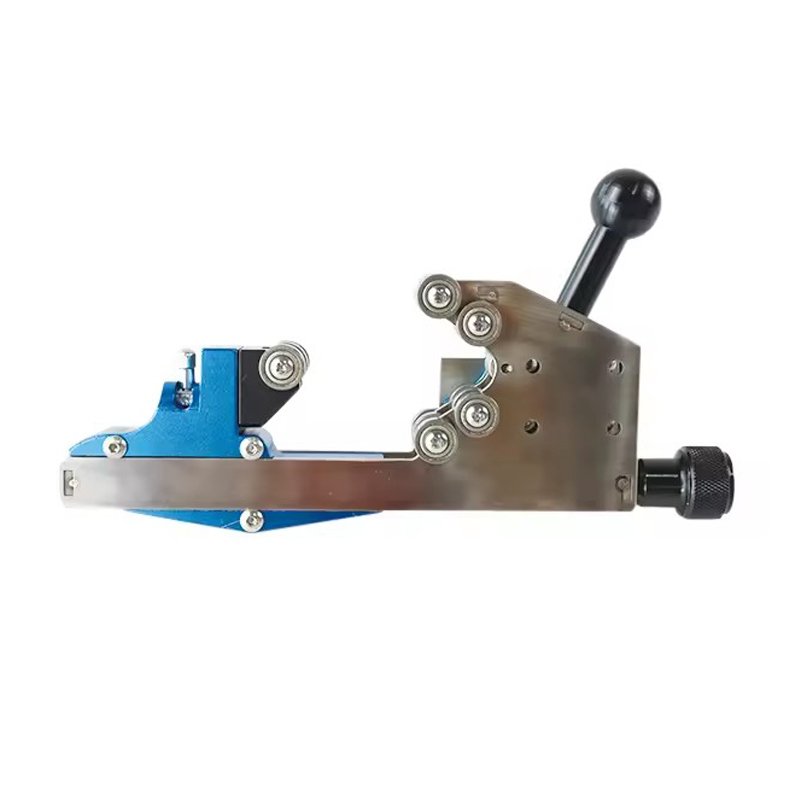 Precision manual tube bender with blue/silver metal body, black handle, and roller mechanisms for accurate metal tubing bends