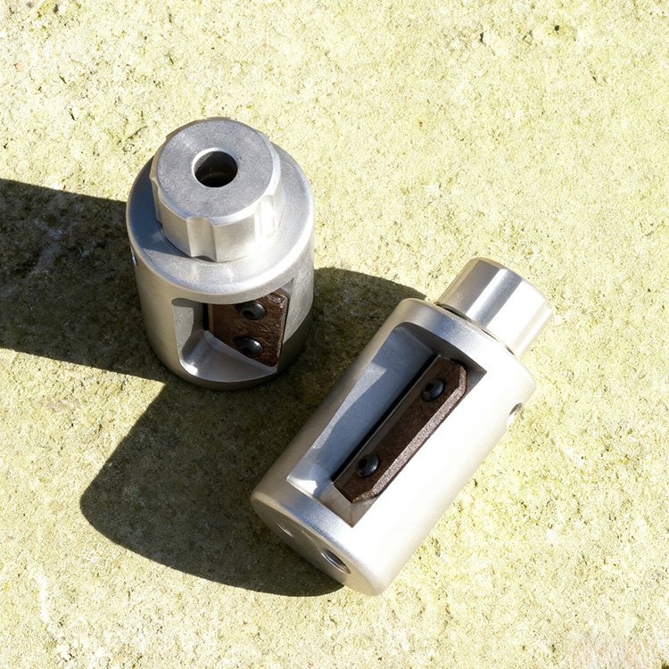 Two silver excavator quick coupler adapters with brown inserts, built for secure tool attachment in construction.