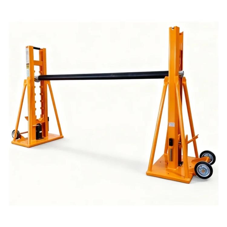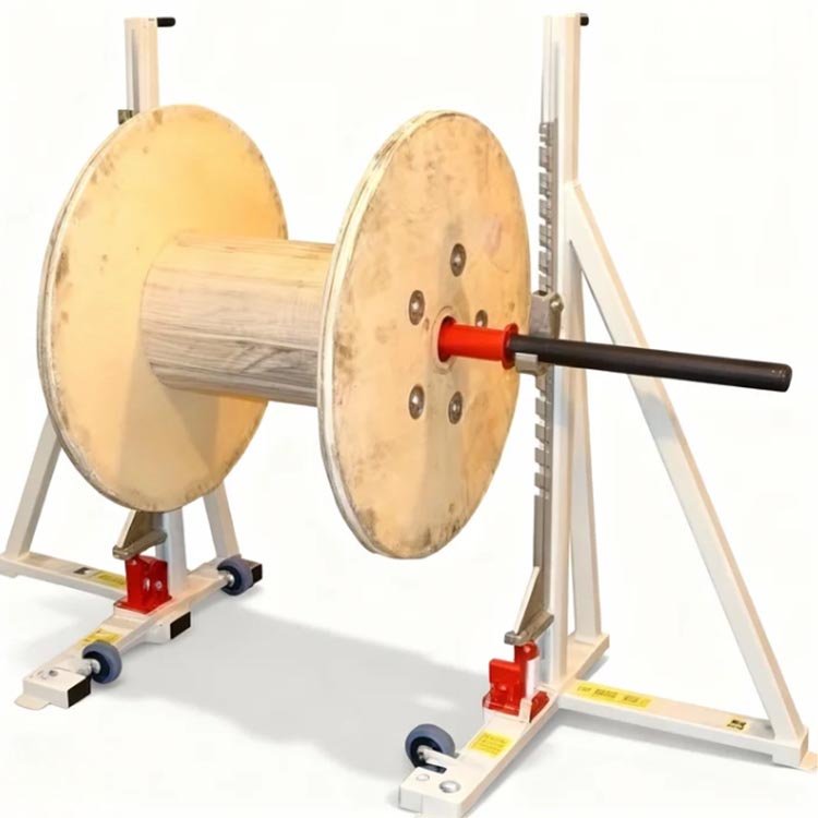 Sturdy adjustable cable reel stand with wheels for easy mobility, ideal for handling wooden wire spools in electrical, construction, and cable installation projects, ensuring efficient cable management.