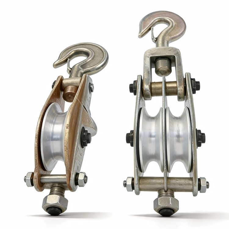 Two heavy-duty pulley blocks with hooks: single and double sheave designs for lifting, rigging, and industrial tasks.