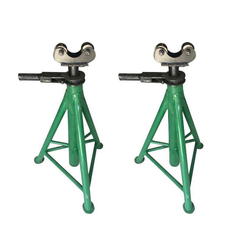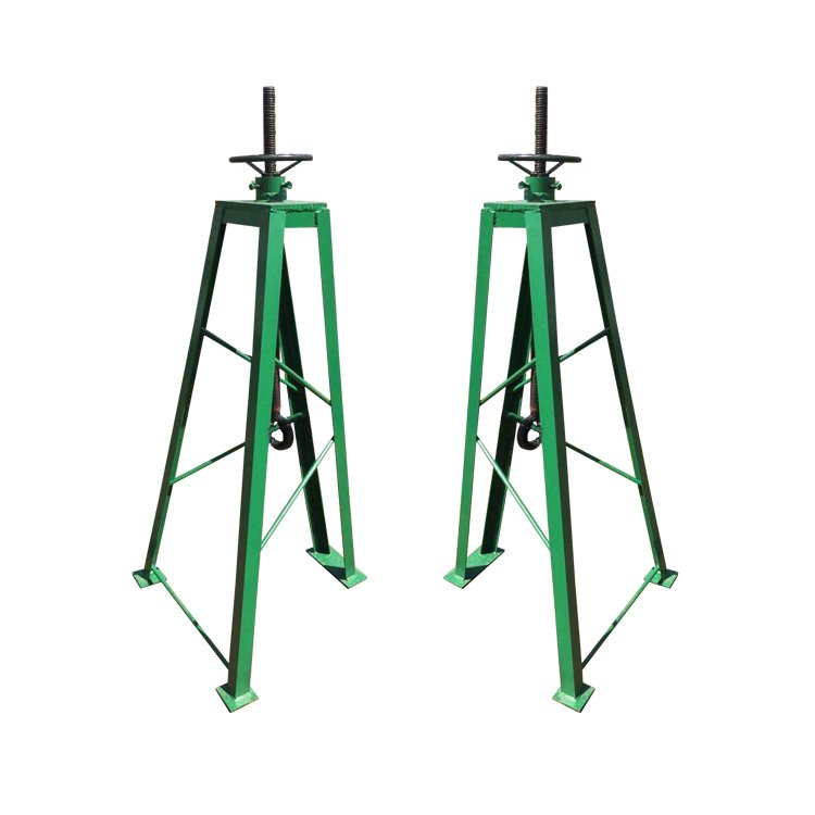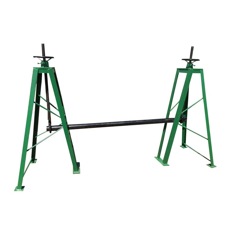 Sturdy adjustable cable reel stand for reliable cable spool support. Stable triangular base, adjustable height for safe, efficient utility work.