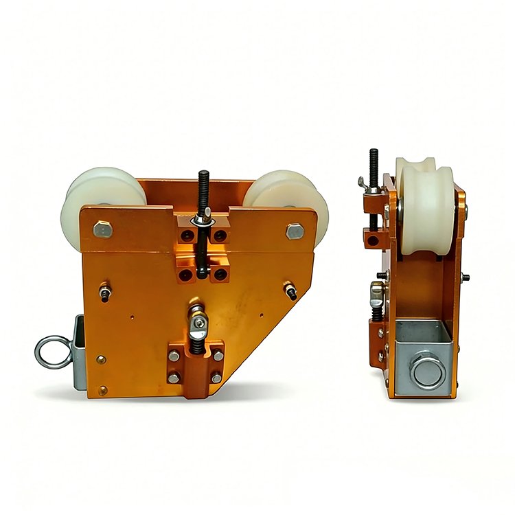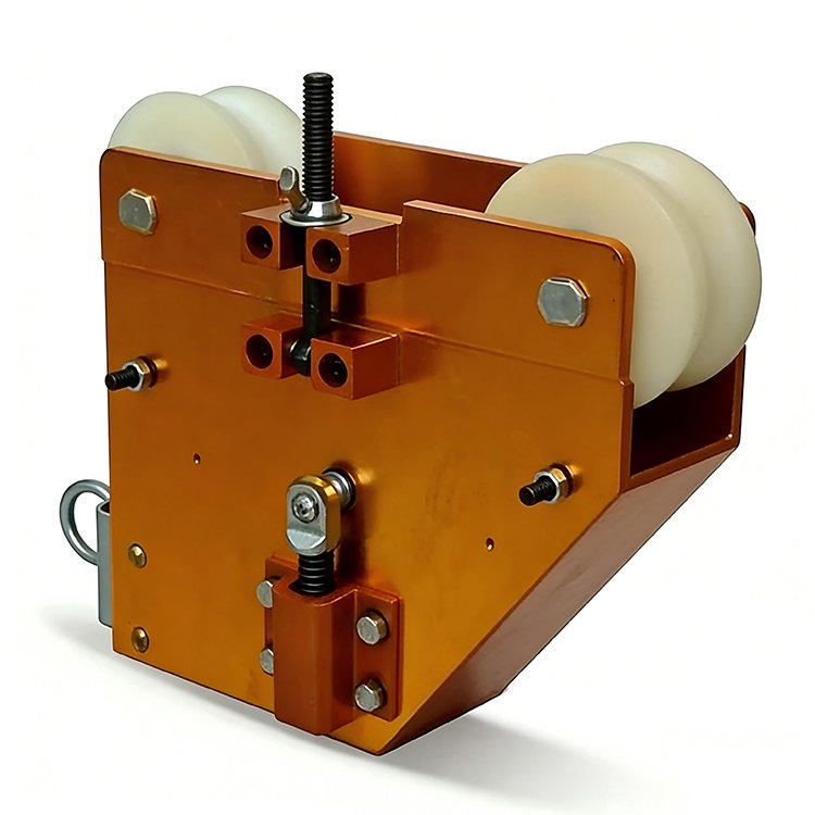 Orange excavator cable pulley tensioner with white nylon wheels, metal bolts, and a ring attachment for construction use.