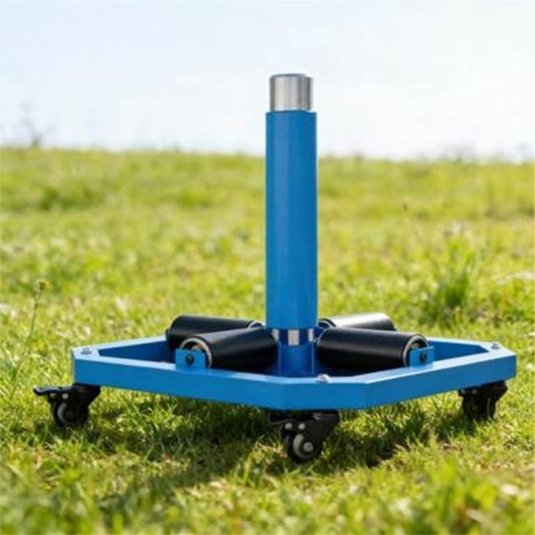 Enhance excavator efficiency with this pipe roller attachment. Durable blue frame, smooth rollers, and wheeled base simplify pipe transport and placement on job sites.