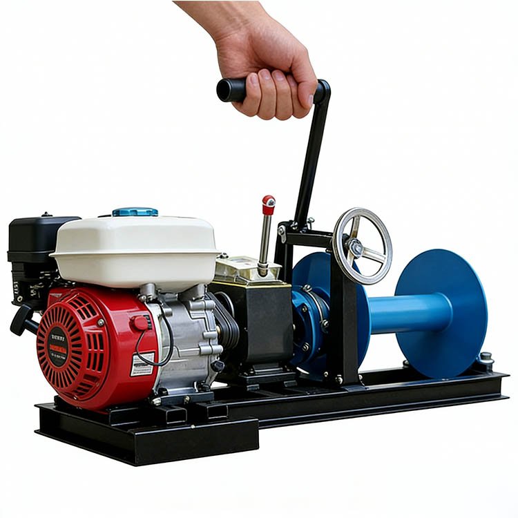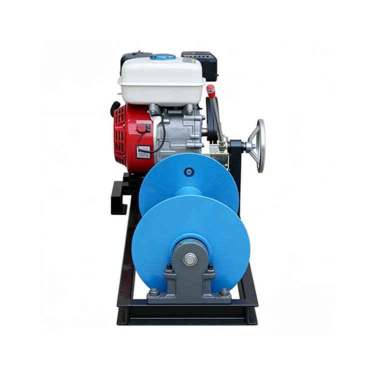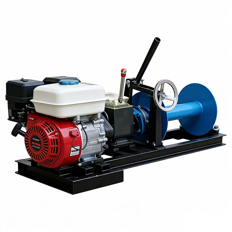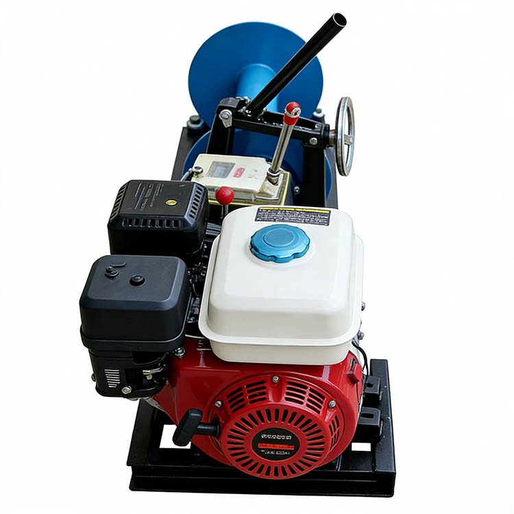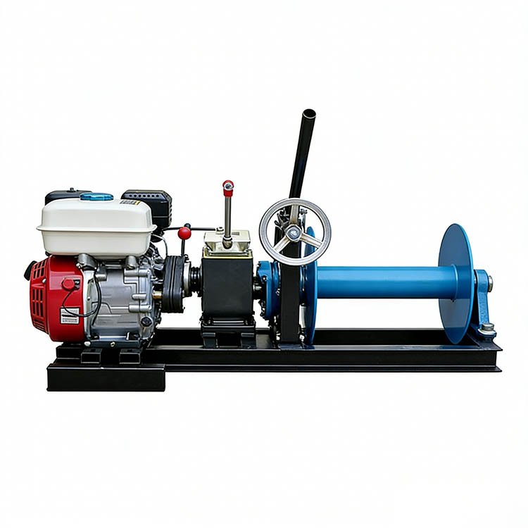 This is a winch, which belongs to light engineering machinery. Its core components consist of an engine assembly, a drum assembly, a gearbox (with a gear shift lever, a clutch lever, and a brake), and a thickened base. It is suitable for scenarios such as electric power construction (cable laying, tower erection, and wire tensioning), small – scale hoisting, cable traction, and mountain timber transportation, and can operate efficiently in complex terrains.
