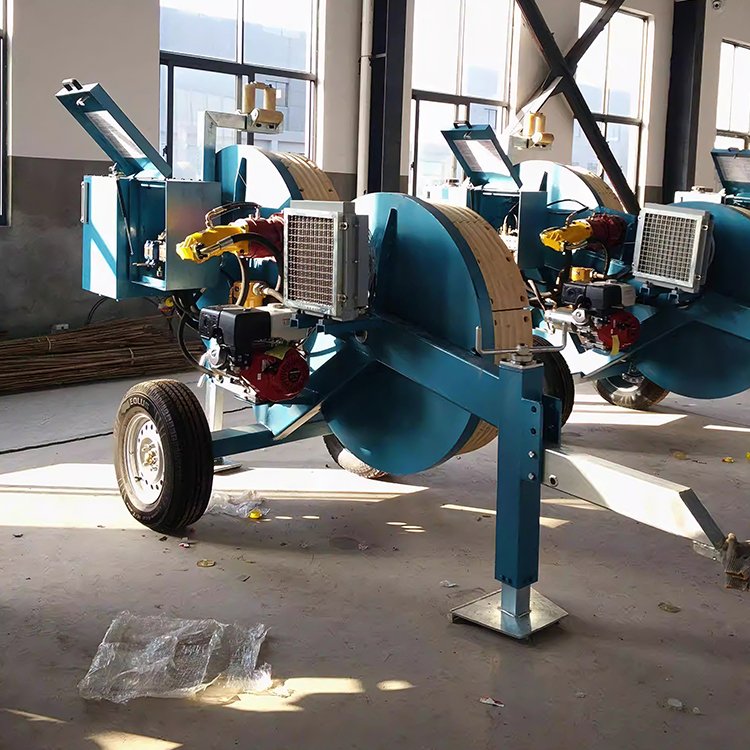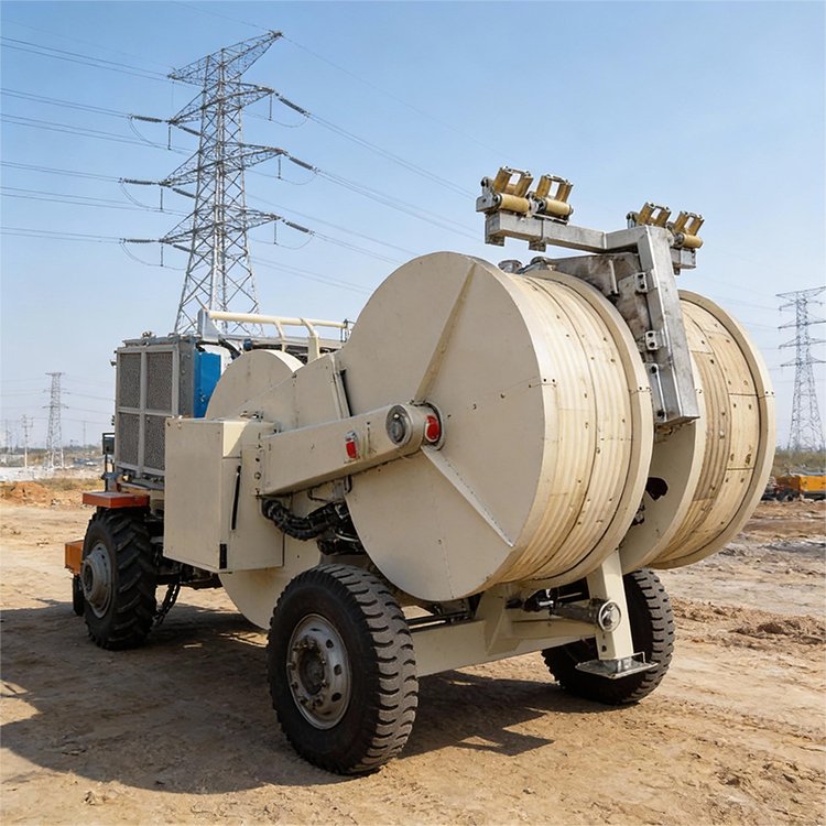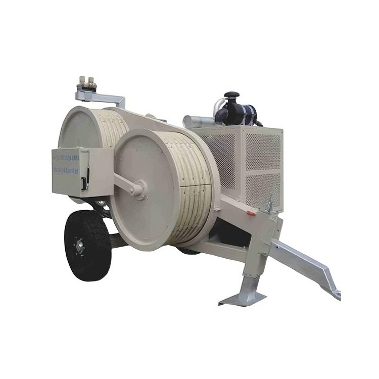Robust hydraulic cable pulling winch with dual reels, engine, and mobile design for efficient power line installation and construction projects.