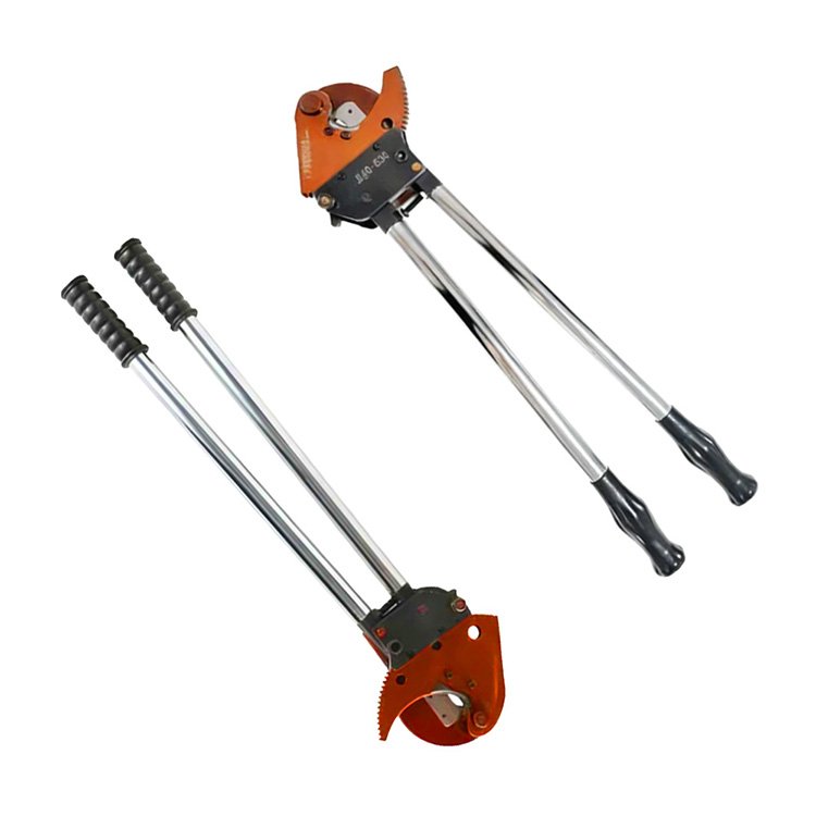 Two manual ratchet cable cutters with orange heads, long chrome handles, and black grips for cutting electrical cables.