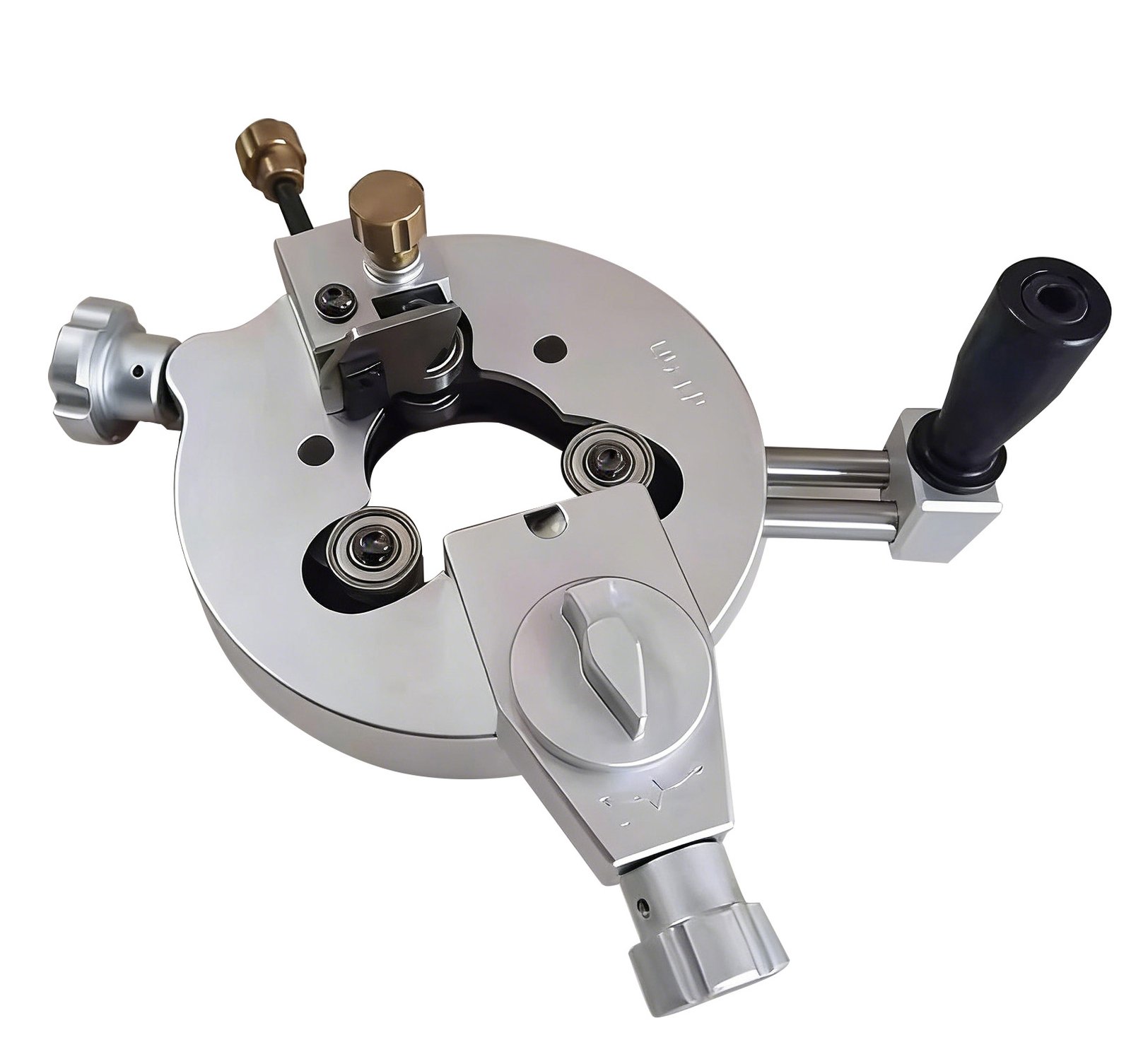 Close-up of a silver hydraulic pipe cutting attachment with black handle, brass fittings, and precision rollers for excavator use.