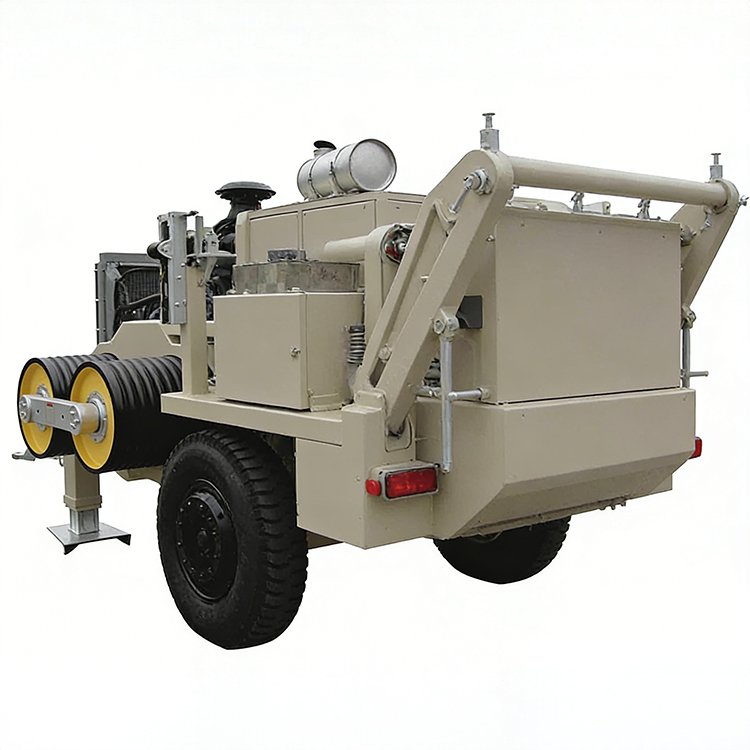 Robust trailer-mounted hydraulic cable puller for efficient power line installation. Features durable reels, powerful engine, and easy mobility for construction projects.